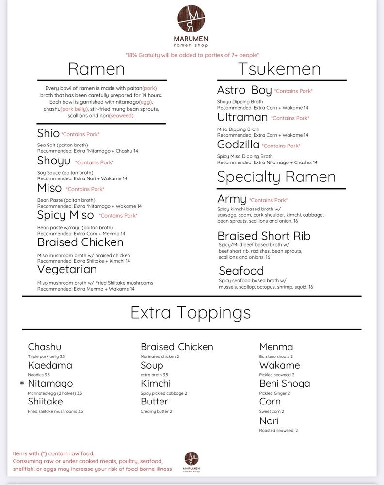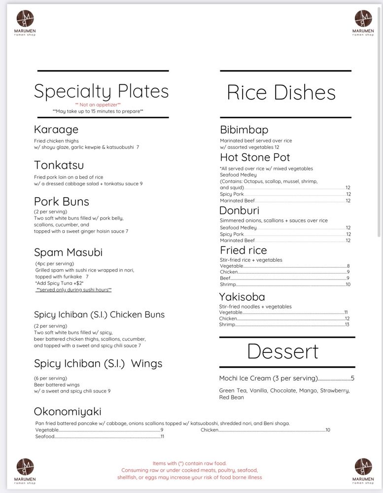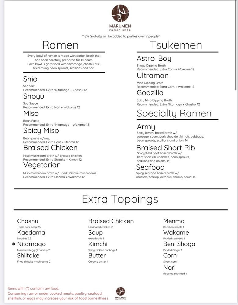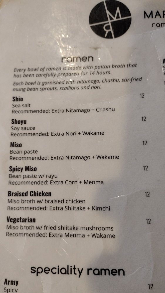 Marumen is a ramen restaurant in Fairfax, VA that offers a range of options and amenities. From Shio Ramen to Seafood Ramen, each bowl is carefully prepared with a 14-hour paitan broth. The Specialty Ramen dishes like Army Ramen and Braised Short Rib Ramen are customer favorites due to their unique flavors. The reviews rave about the excellent quality, generous portions, and professional service. Customers especially love the Spicy Miso Ramen and the Karaage chicken. The cozy interior and attentive staff create a welcoming atmosphere for guests. With a diverse menu and options for everyone, Marumen is a must-visit spot for ramen enthusiasts.